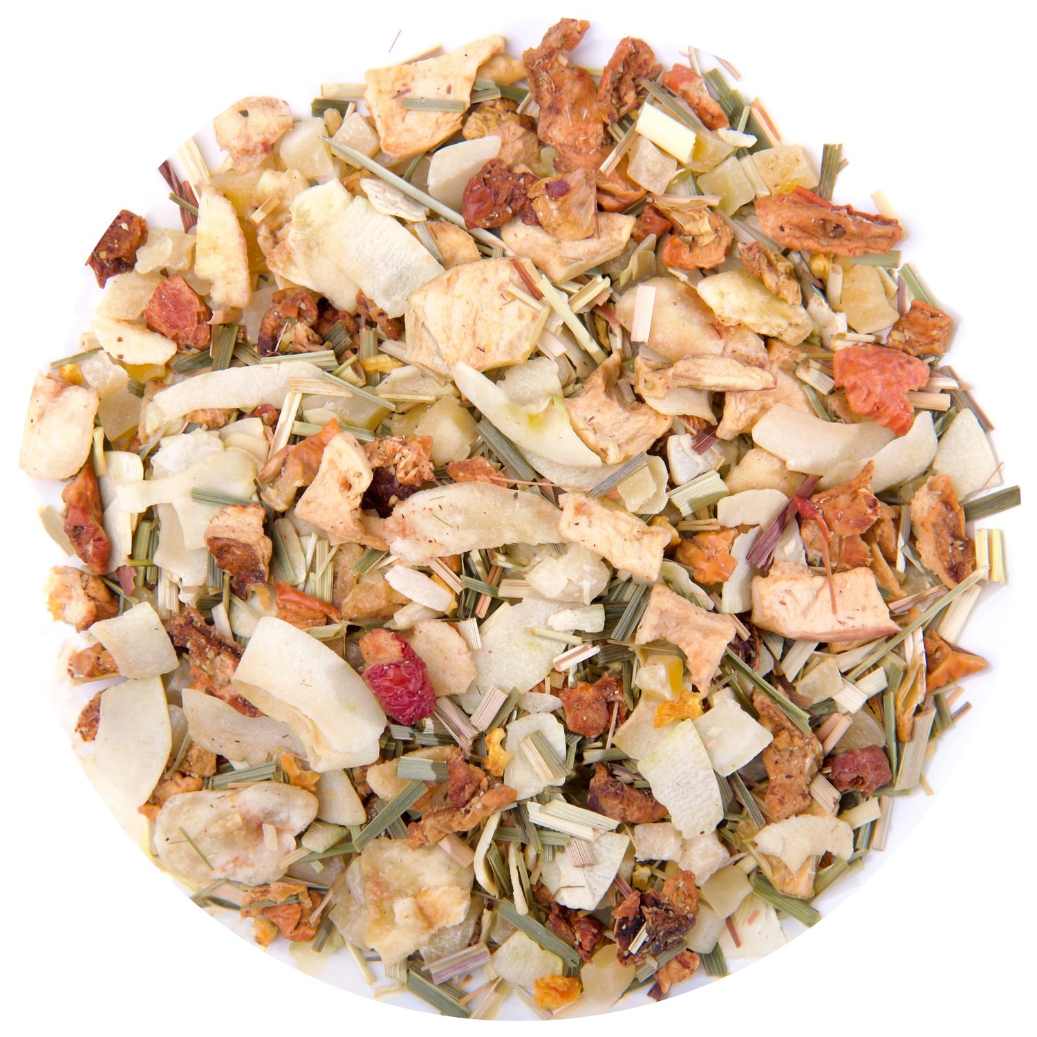 Citroengras, gekonfijte mangostukjes (mango, suiker, zuurteregelaar: citroenzuur), gekonfijte ananasstukjes (ananas, suiker, zuurteregelaar: citroenzuur) (14%), appelstukjes, gesuikerde en geroosterde kokoschips (kokos, suiker), bananenchips (banaan, kokosolie, ruwe rietsuiker), ananasgranulaat (6%), natuurlijk aroma, appelchips, sinaasappelgranulaat, aroma, natuurlijk komkommeraroma.