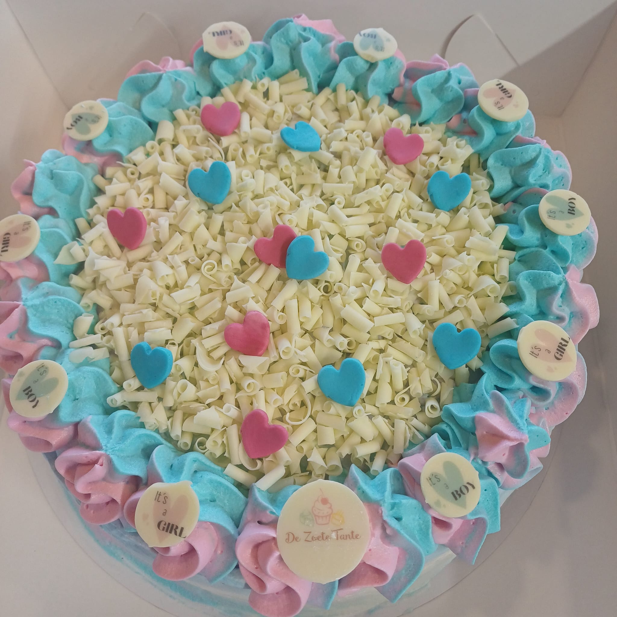 gefeliciteerd jullie zijn zwanger wil je het geslacht bekend maken met vrienden en familie. bij het aansnijden van de taart zie je of het meisje of een jongen word gevuld met roze of blauwe crème. Vaak krijg ik een bericht we hebben in de avond de echo en de volgende willen we de taart graag aansnijden dit kan zeker als ik maar van te voren weet voor hoeveel personen. wil je liever zelf het geslacht ook pas weten bij het aansnijden van de taart? dan mag je de enveloppe bij me afgeven bij het ophalen van de taart krijg je de gesloten enveloppe mee terug. en ja ik heb beroepsgeheim 🙂