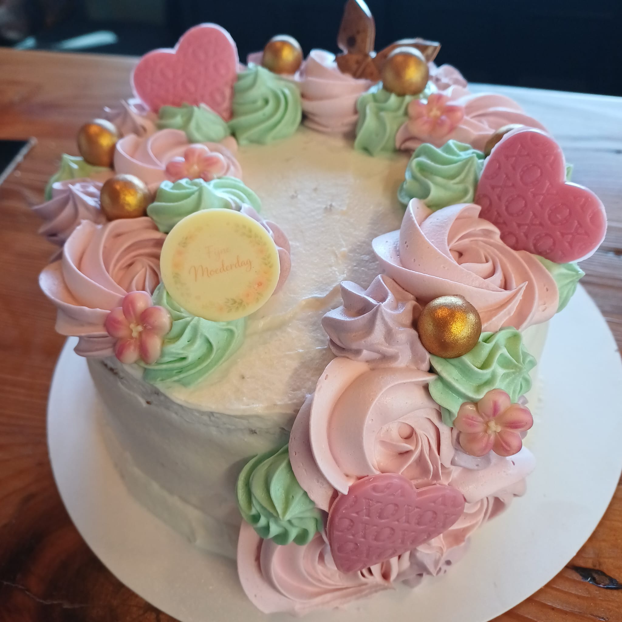Verras mama met een heerlijke Moederdagtaart, gevuld met frisse aardbeiencrème en romige banketbakkersroom. Liefdevol en feestelijk gedecoreerd, speciaal voor haar 💛