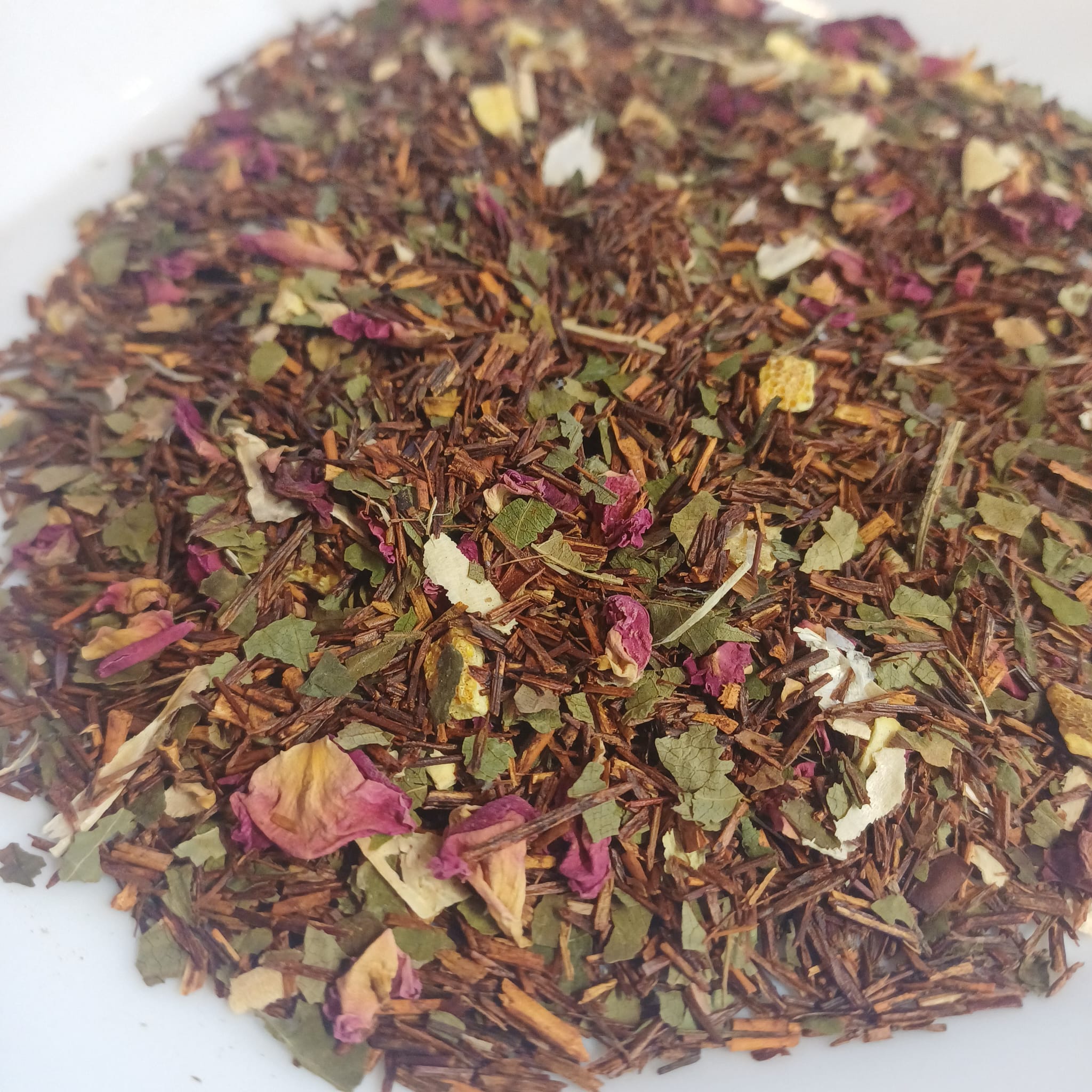 Rooibos, aroma, roze rozenbloesem, sinaasappelschillen, zoete bramenbladeren, bonenschillen.