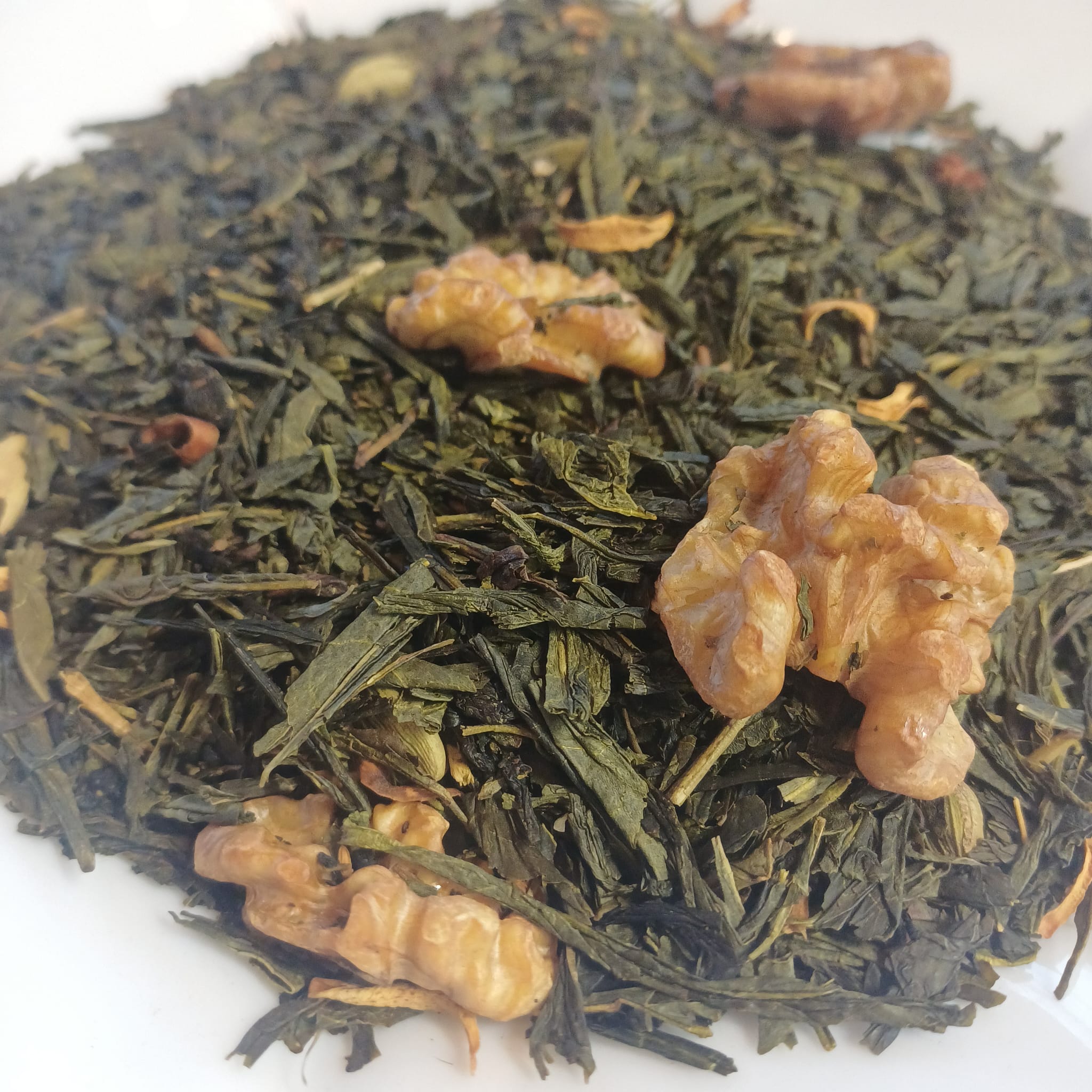 De perfecte thee om tijdens de lange winterdagen mee op de bank te kruipen. Groene thee met walnoten, kardemom en sinaasappel. Dat is een losse thee om royaal van te genieten!
